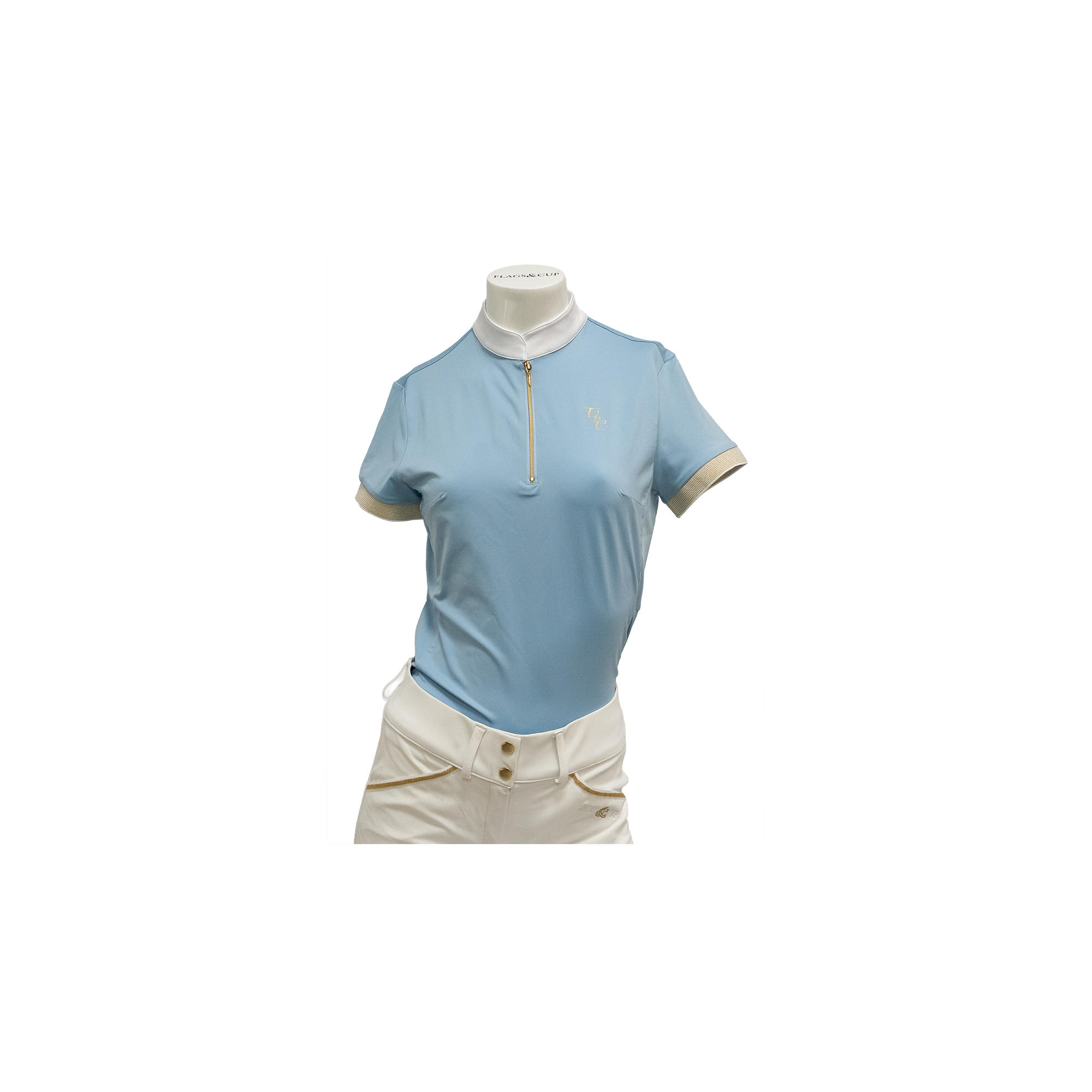 Andria Competition Polo – Elegance & Performance Soft, lightweight, comfortable, and breathable, the Andria competition polo from Flags&Cup is perfect for equestrian competitions. Designed to combine elegance and performance, it enhances a refined feminine style with golden details and an embroidered F&C logo on the chest.